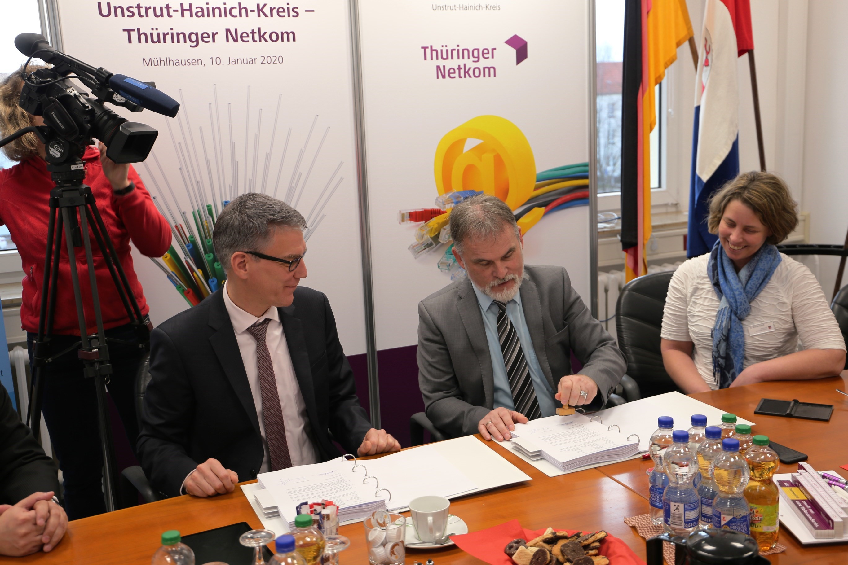 Mühlhausen. Mit der Unterzeichnung des Ausbauvertrages haben heute der Unstrut-Hainich-Kreis und die Thüringer Netkom GmbH den Start für den Aufbau eines Glasfasernetzes zur Breitbandkommunikation im Landkreis vertraglich besiegelt. Den Zuschlag für den Bau des Glasfasernetzes hatte die Thüringer Netkom GmbH aus Weimar nach einem mehrere Monate dauernden Ausschreibungsverfahren bekommen - insgesamt 12,839 Mio. Euro können jetzt in den Netzausbau investiert werden. Bis 2022 sollen unter anderem rund 600 Kilometer Glasfaserkabel verlegt werden.