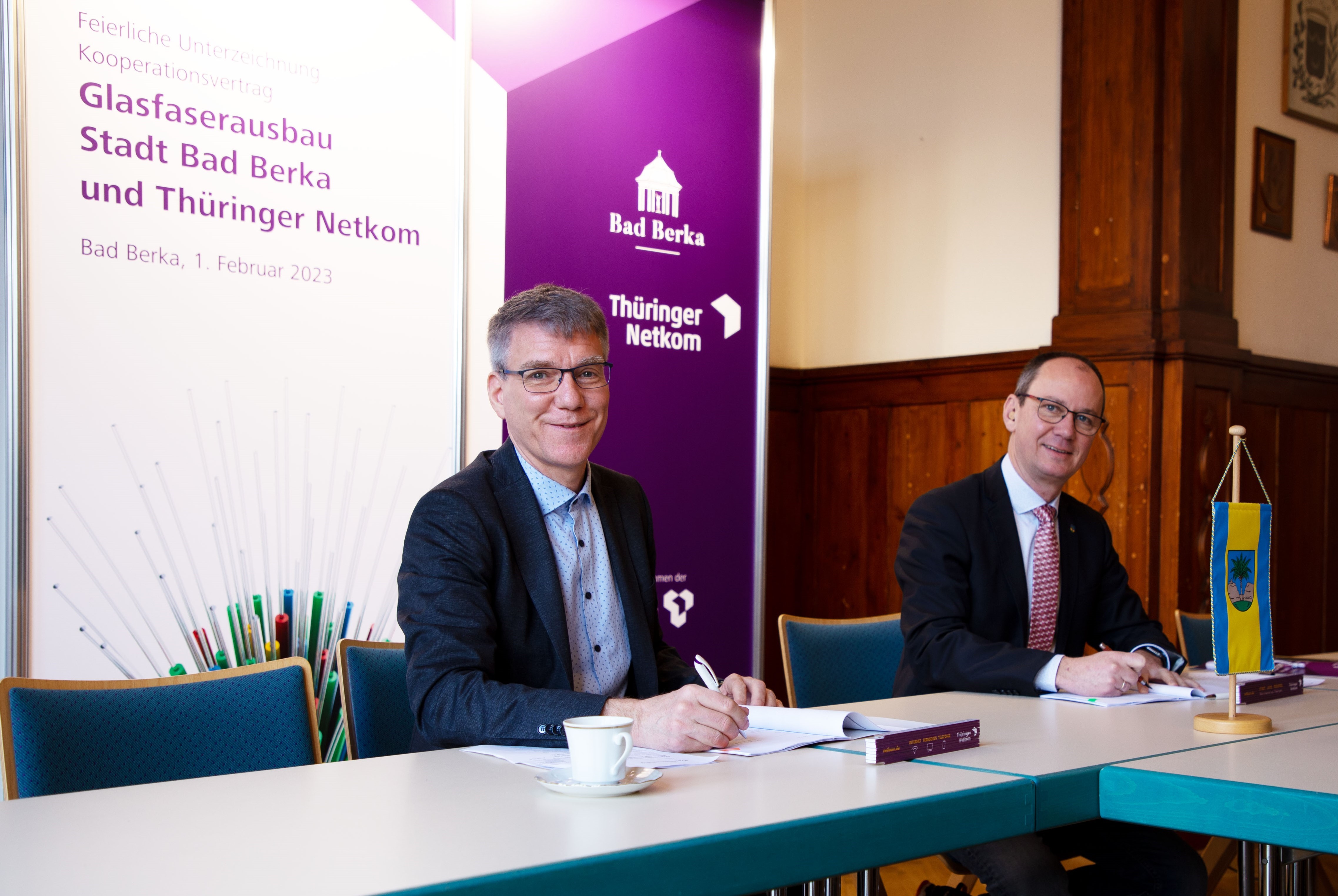 Bad Berka. Im Stadtgebiet Bad Berka und seinen Ortsteilen soll bis Februar 2026 ein Glasfasernetz mit Direktanschlüssen bis in Wohn- und Geschäftsgebäude gebaut werden. Das sieht die Kooperationsvereinbarung vor, die am Vormittag im Ratssaal des Rathauses Bad Berka von Bürgermeister Michael Jahn und Karsten Kluge (Geschäftsführer Thüringer Netkom) unterzeichnet wurde. In der voraussichtlich 36 Monate betragenden Bauzeit sollen rund 4.300 Haushalte mit Glasfaserdirektanschlüssen versorgt werden - ca. 10 Mio. Euro wird die Thüringer Netkom dafür investieren. Das Infrastrukturvorhaben wird von der TNK eigenwirtschaftlich umgesetzt - es fließen also keinerlei Fördermittel.